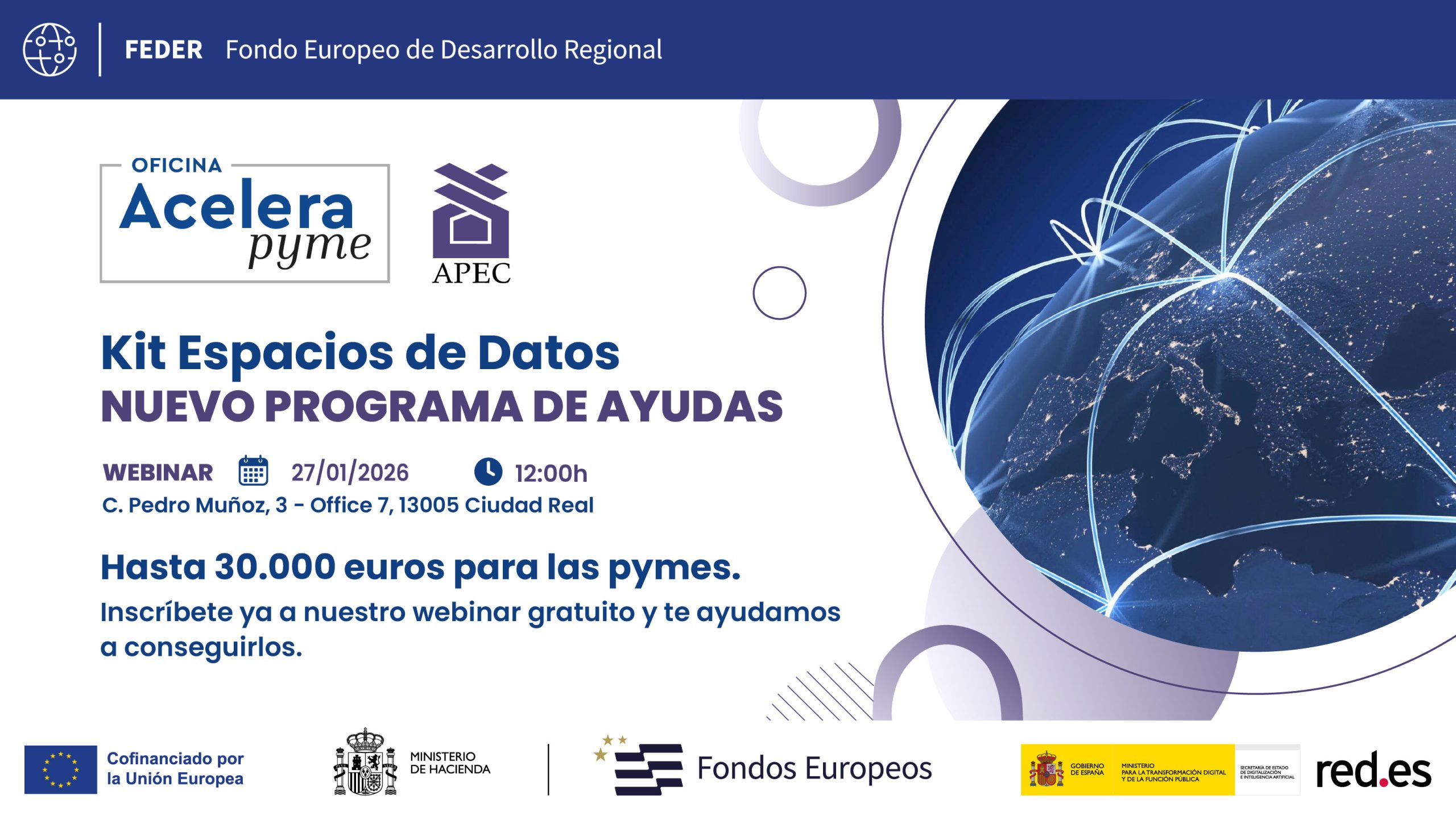 Te invitamos a participar en nuestro webinar, con asistencia presencial u online , donde te explicaremos qué es el Kit Espacios de Datos y cómo tu empresa puede conseguir hasta 30.000 € con esta nueva ayuda a fondo perdido.